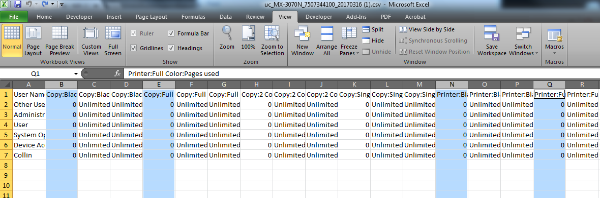 - There is a lot of information on the Excel spreadsheet, but for billing purposes you’re likely only concerned with B&W copies, Color Copies, B&W Prints, and Color Prints. I’ve highlighted those columns in the pictures below. Columns B, E, N, Q.