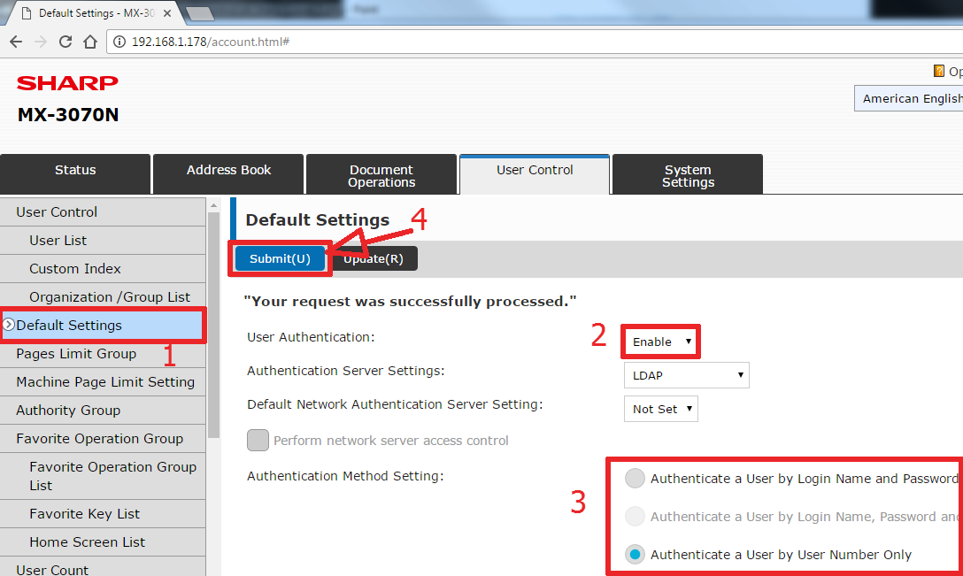 - In the User Control menu, click Default settings on the left. Enable User Authentication, and choose the type of authentication you want to use then click Submit. For the sake of this example, I chose the “Authenticate a User by User Number Only” option, but you can use Active Directory, LDAP, or even use HID cards/badges to login.