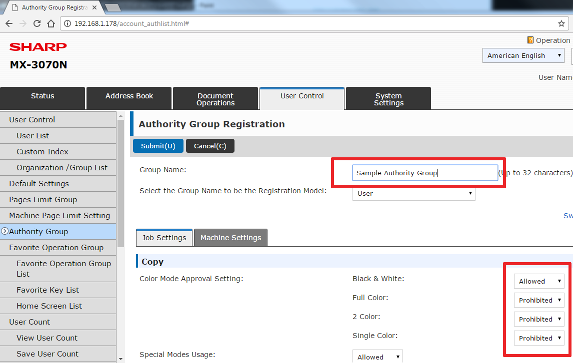 - Open the web interface of the Sharp by entering the IP address into your web browser’s IP address bar. Sharp GUI open, click User Control at the top of the page.